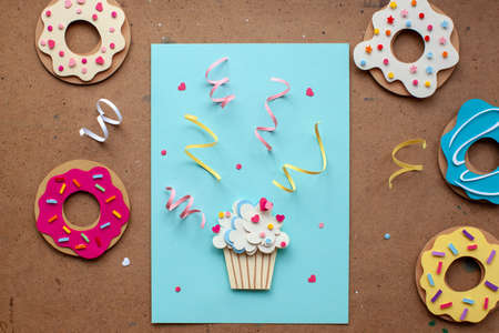 孤立した背景に2つの切り絵カップケーキ。手作りのアートワーク。バースデーカードのデザインに、カラフルなスプリンクル、ドット、スター。紙吹雪。休日のインスピレーション。の写真素材・画像素材Image 145243986。
