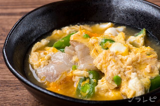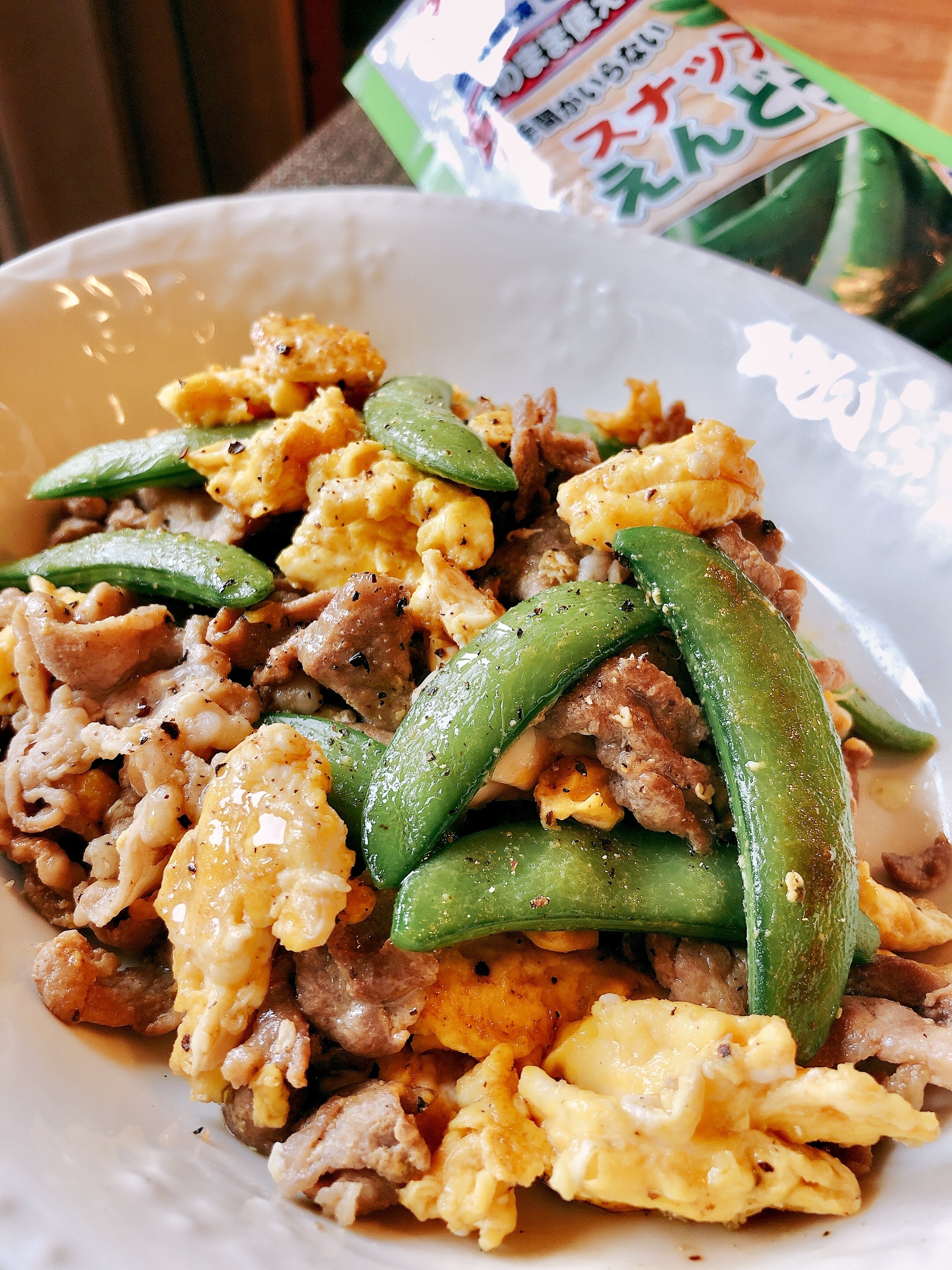 スナップエンドウと卵の豚肉炒めのレシピトクバイ。