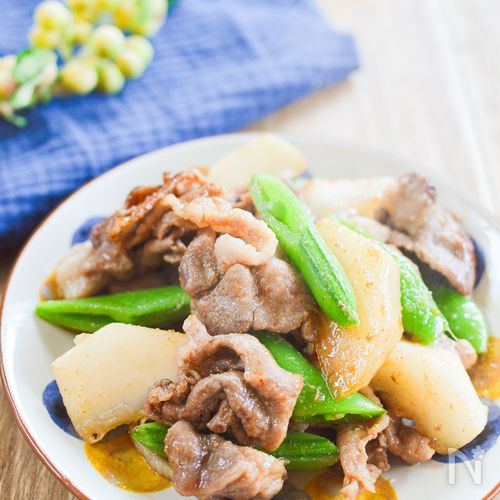 豚こまとスナップエンドウのオイスターソース炒め - おうちで楽しむ簡単レシピ。