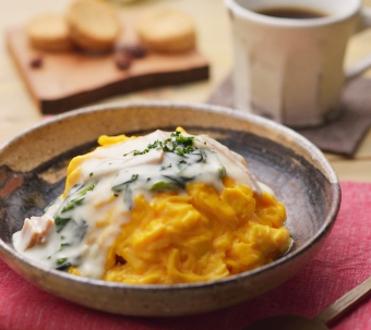 基本の料理 ふわとろ卵の「オムライス ほうれん草とベーコンのホワイトソース」コトラボオレンジページの体験型スタジオ。