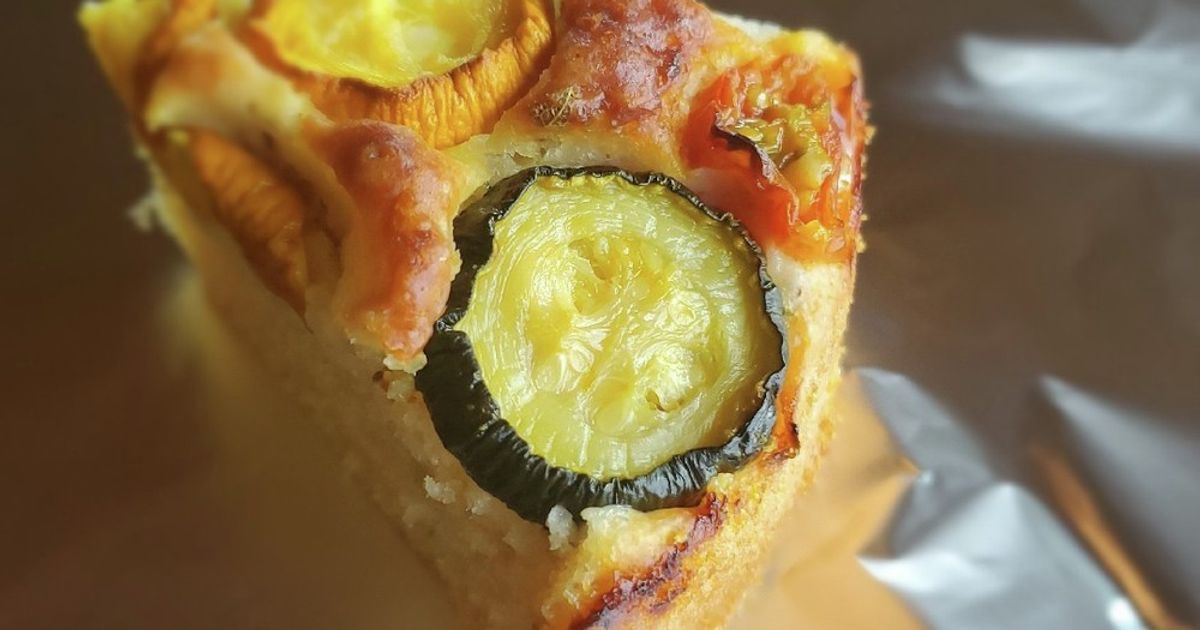今年の夏に, 夏野菜のケーク・サレを作りました⛵🇫🇷, ズッキーニやパプリカをふんだんに入れて、, カラフルなお惣菜のケーキ。,チーズを使った生地は甘くなく、, ブランチにもぴったり👌, 味は主人によると, 「ピザみたい」だそう 笑 , たしかに甘いケーキではないし、,どちらかというとお惣菜パンに, 似ているかもしれませんね🤗, 米粉なので少しもっちりとした食感で、, くせになりますよ😏,。