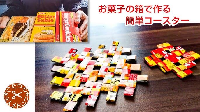 DIY お菓子の箱で作る 簡単コースター*石畳み編み リサイクル手芸 エコクラフト。