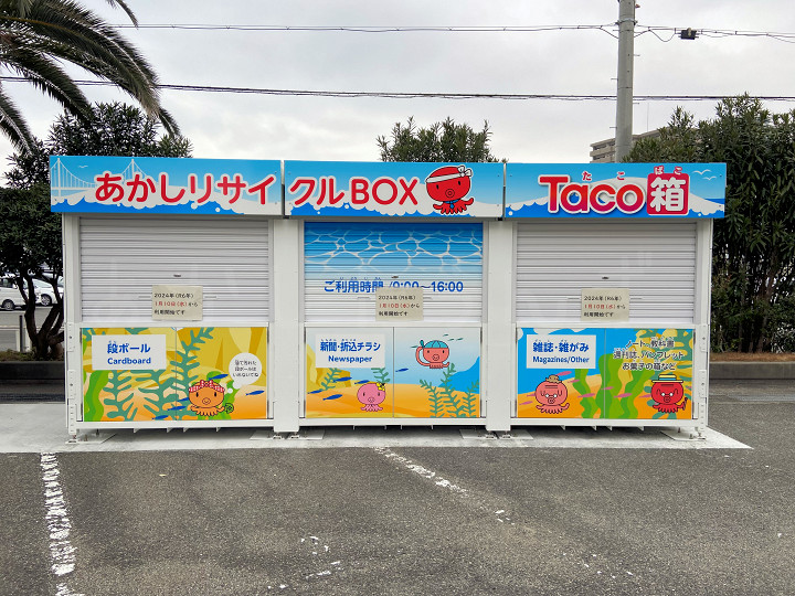 市内2か所目🐙あかしリサイクルBOX 「Taco箱」を 明石クリーンセンターに設置しました🐙紙ごみを分別し、再資源化するため、段ボールや新聞・雑誌などを回収するTaco箱を明石クリーンセンターに設置しました。設置場所 明石クリーンセンター受付前利用時間。