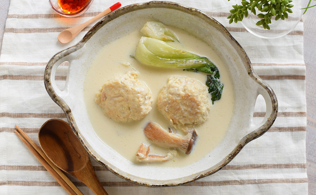 ワンパン!包丁いらずで簡単!鶏だんご豆乳スープ豆乳レシピマルサンアイのお料理レシピマルサンアイ株式会社。