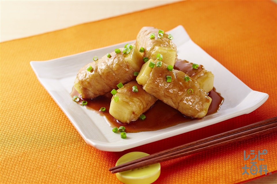 お餅の肉巻きの献立 副菜:揚げ野菜のだし浸し、汁物:ごぼうと大根の梅けんちん汁 献立・メニュー 味の素パーク たべる楽しさを、もっと。
