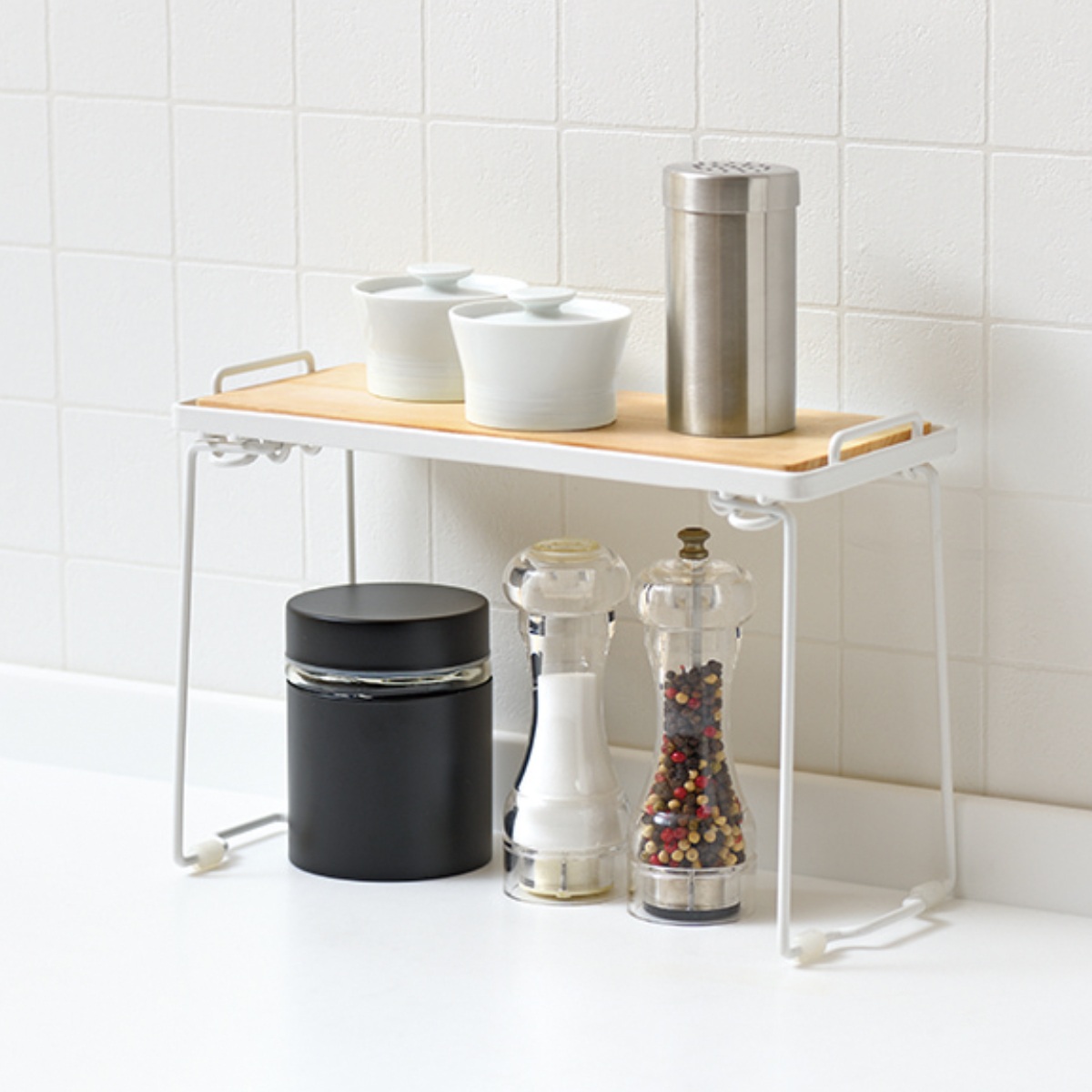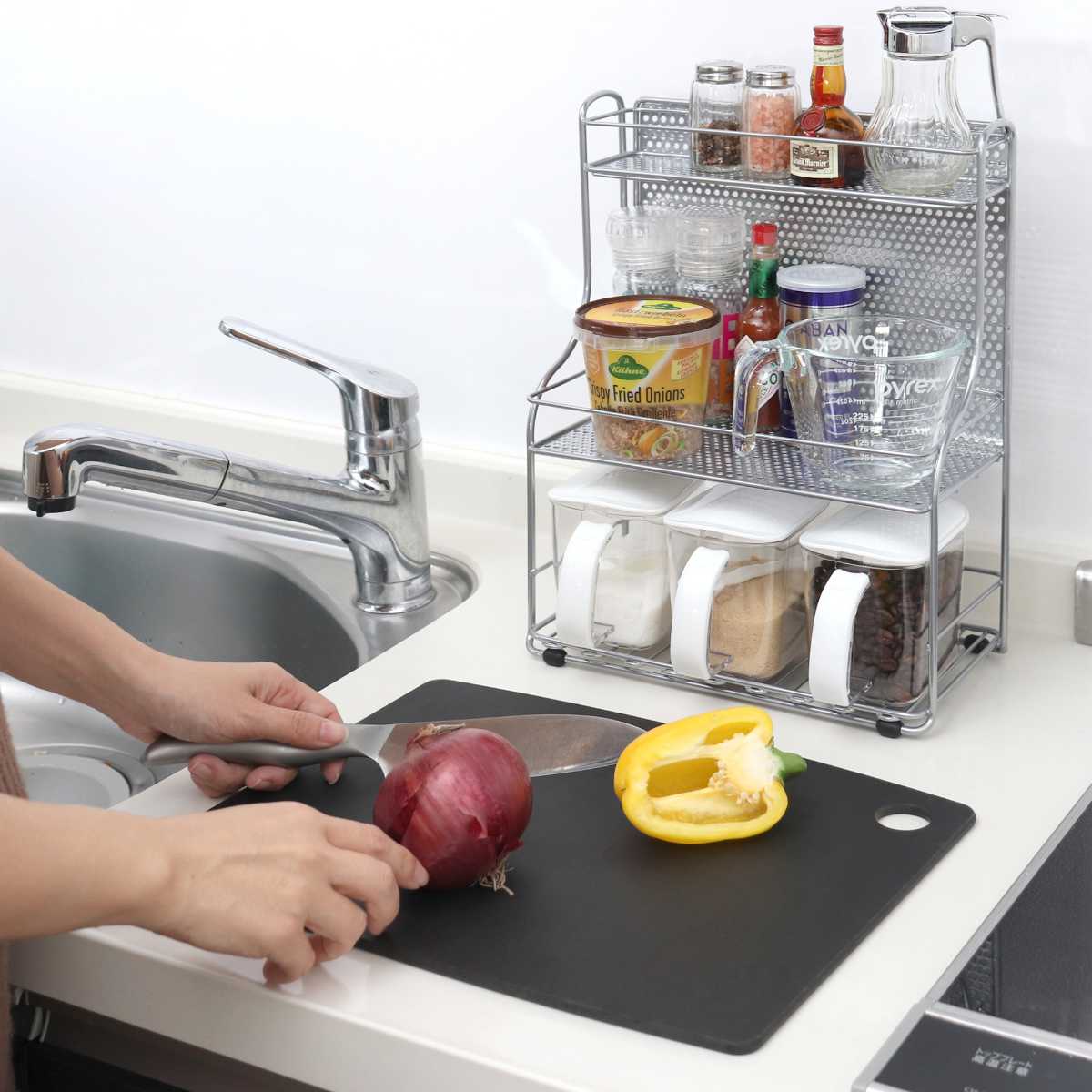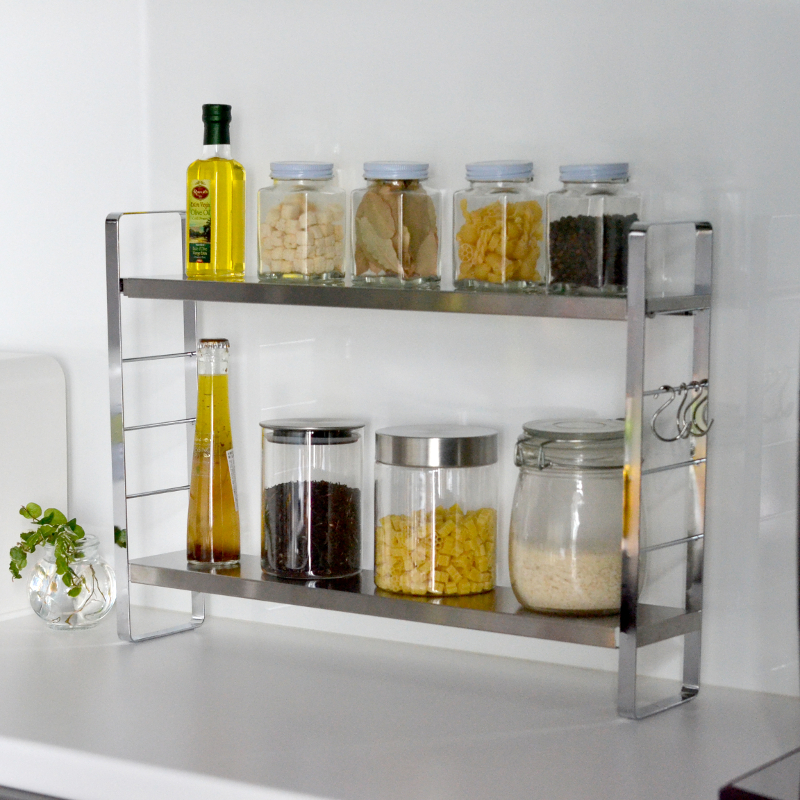 スパイスラック 2段 高さ調整 スタッキング可能 幅45cm 調味料ラック コンパクト 引っ掛け棚 スリム 省スペース収納 棚 キッチン カウンター上シンク下 デスク上 スパイス 調味料 すき間 隙間。
