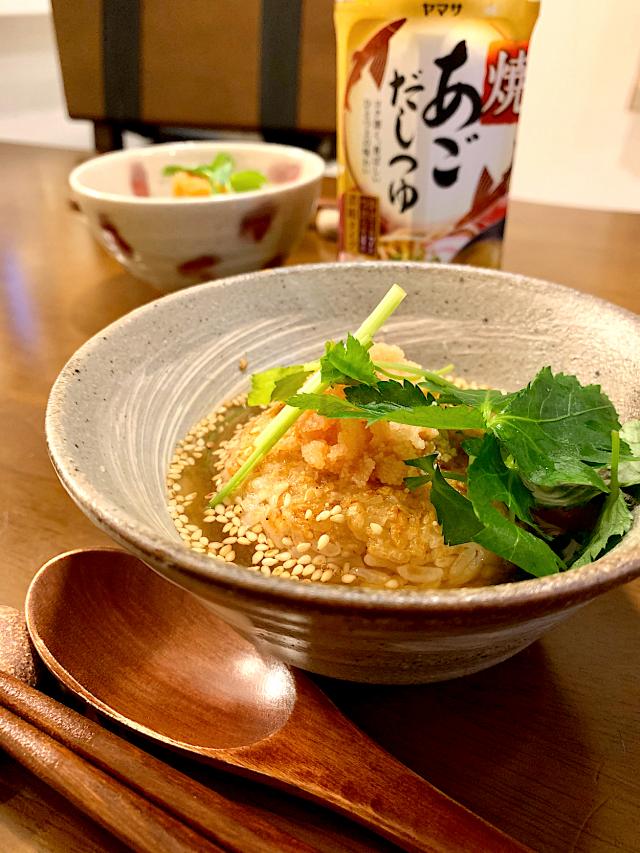炊き込みご飯で焼きおにぎりの冷やし出汁茶漬け。