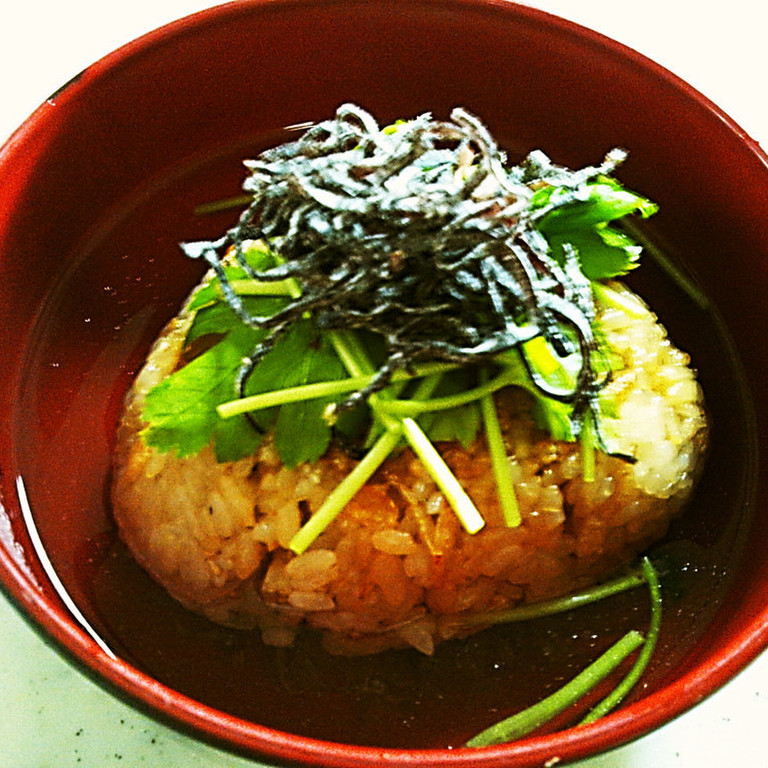 麹の魚醤 : 焼きおにぎりのだし茶漬け。