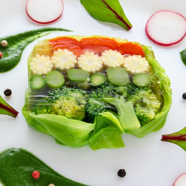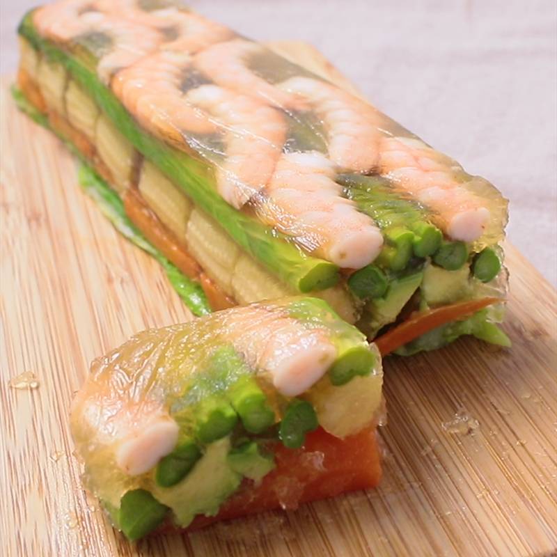 ワサビソースで味わう彩り野菜のテリーヌ ゼラチンなし。