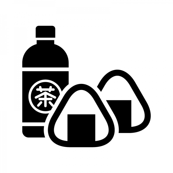 お茶のペットボトルとおにぎりのシルエット無料のAi・PNG白黒シルエットイラスト。
