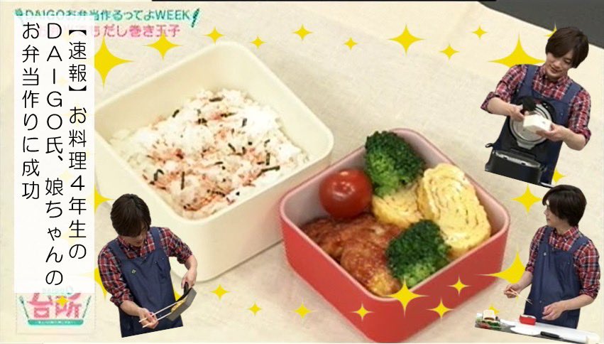 DAIGOも台所 〜きょうの献立 何にする?〜公式 🍳 on X: "計量や皮むきだけで 15分番組が終わりそうだった4年前それでも娘ちゃんのお弁当を作れるようになりたい! と頑張ってきたDAIGO✨️ 今日ついにお弁当作りに成功‼️㊗️DAIGOも台所 史に 残る感動を。