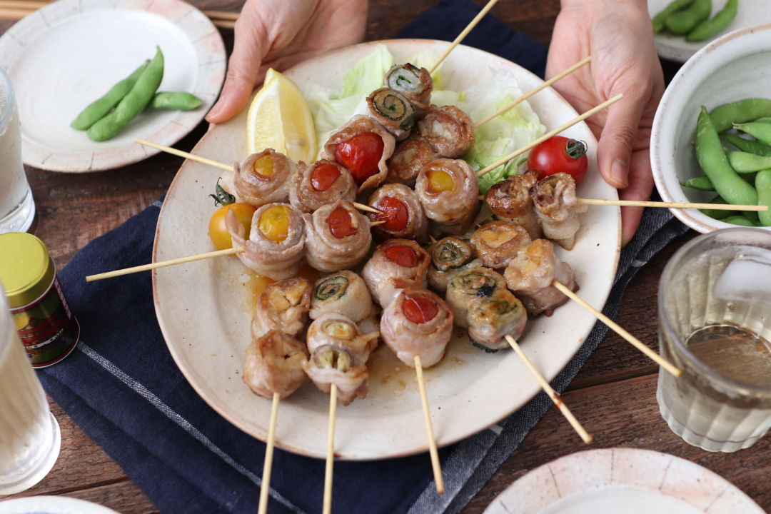 ぐっち夫婦のこんな日ごはん休日はみんなを招いてホームパーティー! 「彩り野菜の豚バラ串焼き」。
