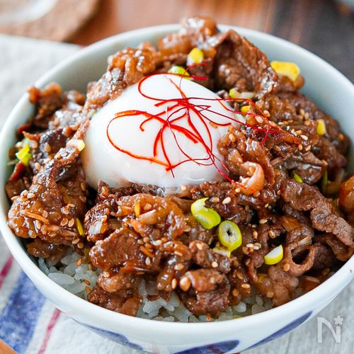 牛コマで作る甘辛しょうゆ丼のレシピ。