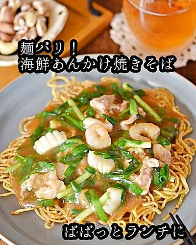 レシピはこちら⇩, ■海鮮あんかけ焼きそば-http:momrecipe.net recipe 001461 ,2人分 ,冷凍シーフードミックス200g, 焼きそば2袋, 小松菜1 2袋 100g , ごま油小さじ2, A水200ml、塩小さじ1 6g ,B水300ml、鶏ガラスープの素小さじ2, Bしょうゆ・オイスターソース小さじ1, Bおろしにんにく・おろし生姜小さじ1 2,。