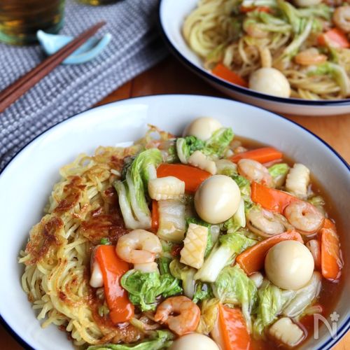 シーフードミックスで*海鮮あんかけ焼きそば。