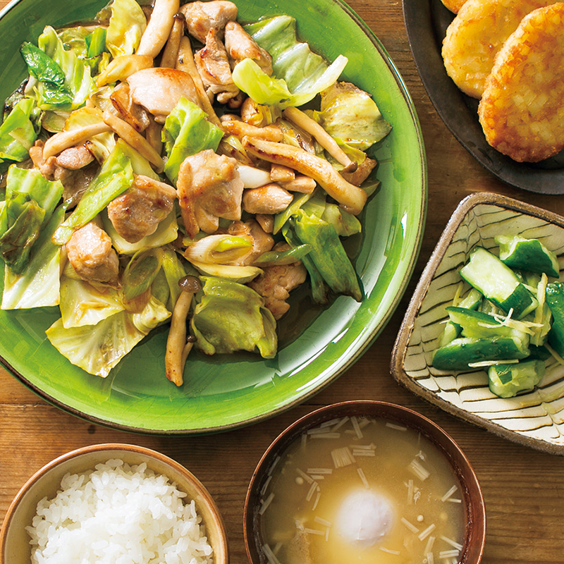 鶏肉と春キャベツのガーリックバターぽん酢炒め。