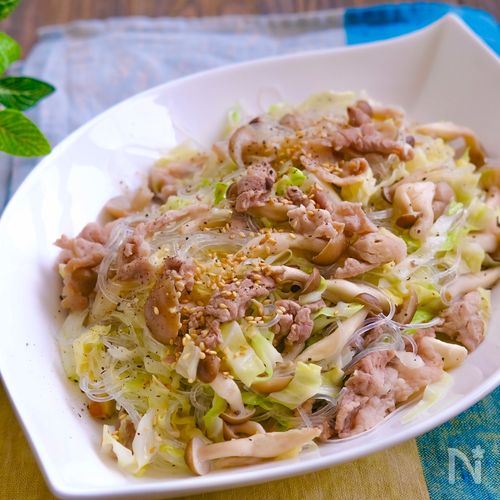 豚こまとキャベツとしめじのさっぱり旨塩春雨炒め。
