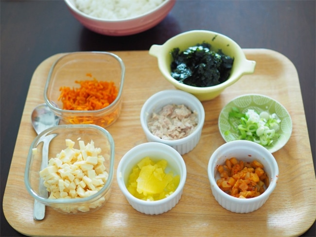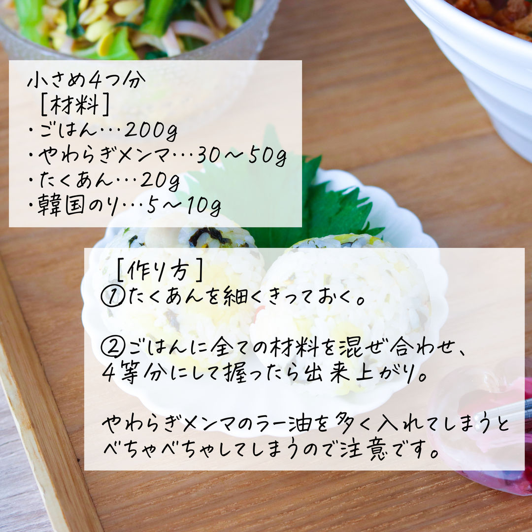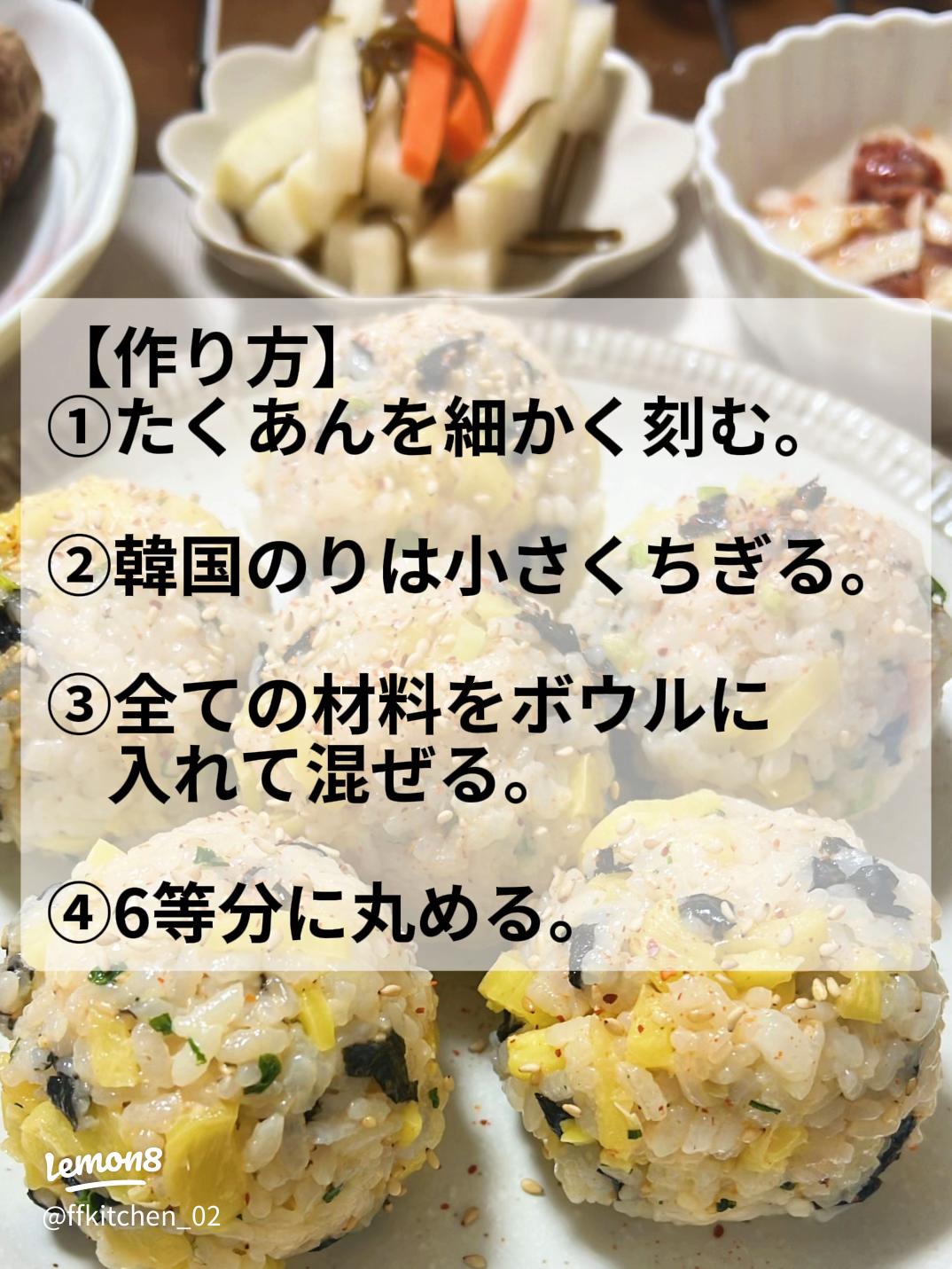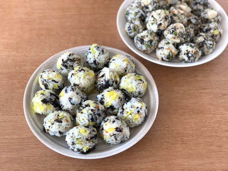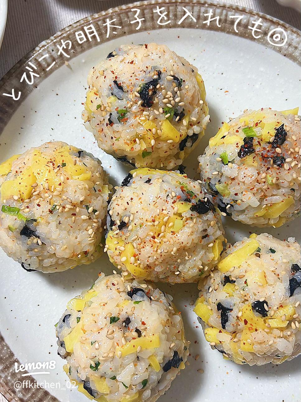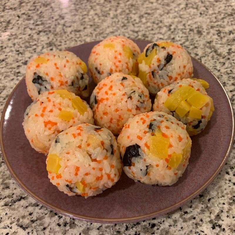 子どもとつくる韓国風おにぎりのチュモッパ ——————————————————————— とびっこのぷちぷちとたくあんのカリカリ食感が癖になるチュモッパ は材料を混ぜて丸くするだけなので簡単で美味しい。焼肉屋さんのサイドメニューでできてお子が喜んでたのでお家で再現してみた。