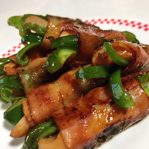 お弁当のおかずにぴったり♪ ピーマンのベーコン巻き。