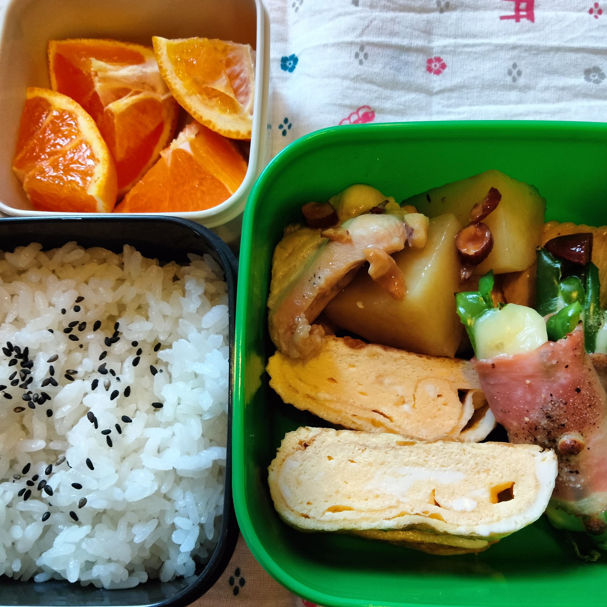 本日のお弁当 作り置き豚こま茄子甘酢炒め ピーマンベーコン巻き 毎日卵焼き 自然解凍枝豆 作り置き青梗菜胡麻和え KaoriSnapdish スナップディッシュID:D5LzCa。