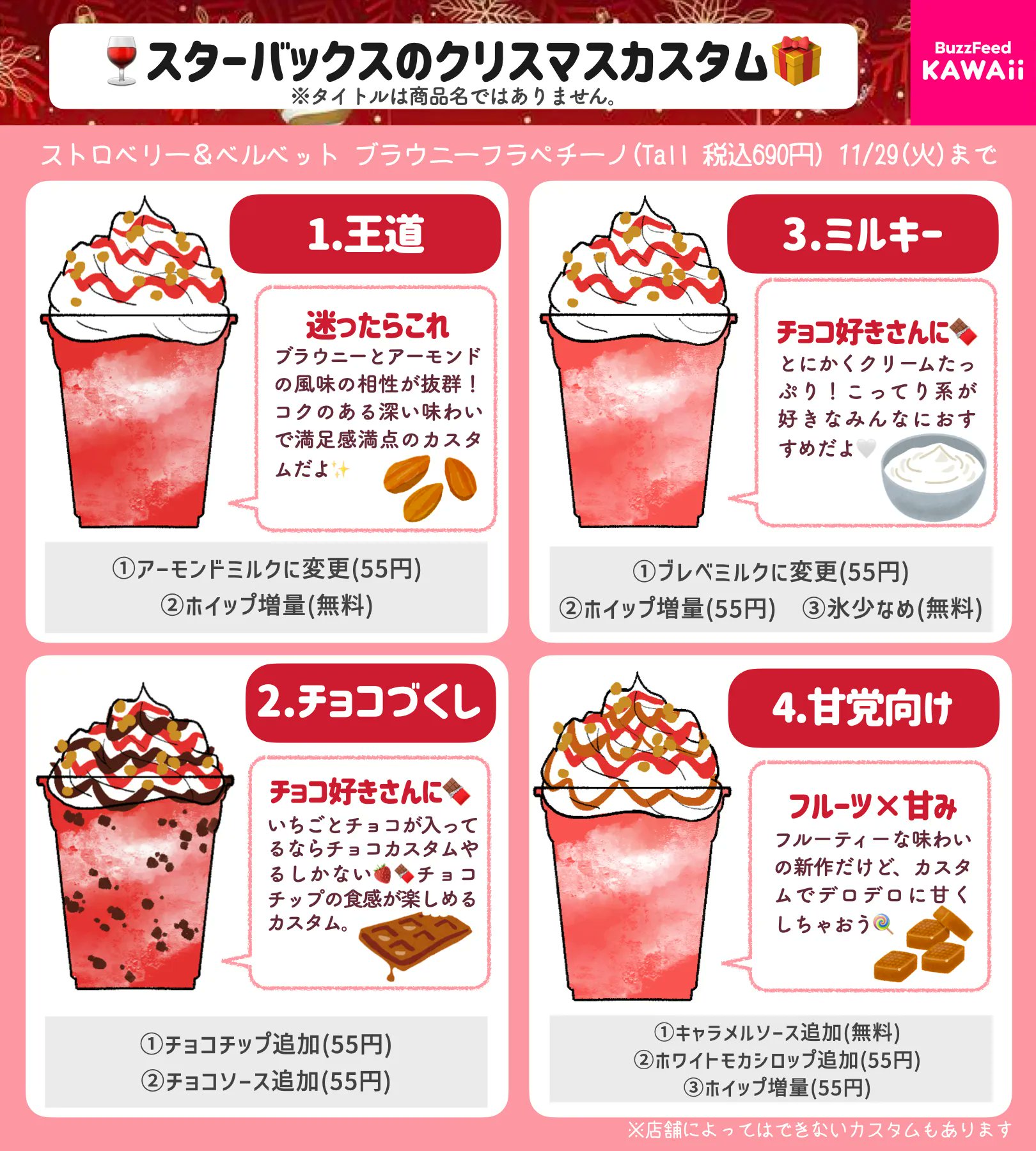 BuzzFeed🌼Kawaii on X: "スタバ新作のおすすめカスタムをまとめました🎁❤️ストロベリーandベルベットブラウニーフラペチーノ https:t.co hwsn9nkZr5"X。