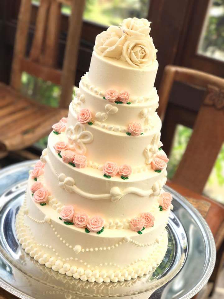 早川ベーカリーの幸せのお手伝い マジパンのバラをトッピングして4段に仕上げました。 セクシーケーキ、中からお金が出てくるマジックケーキ皆さんのアイデアを形に致します。どんどん投げかけてきださ。