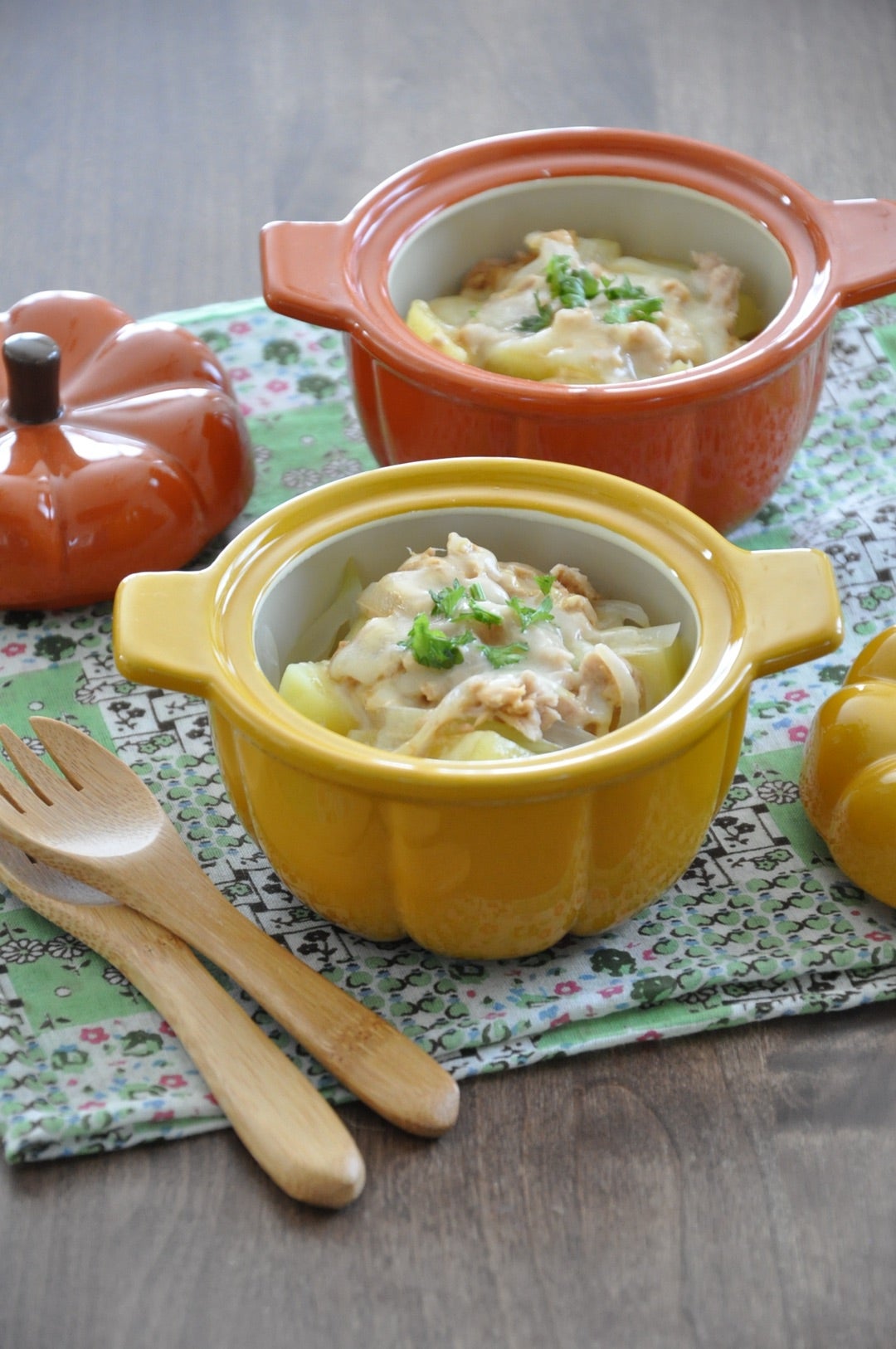 まるみキッチン 簡単レシピon X: " レンジで簡単!ほくほくポテトグラタン①玉ねぎ1 2をくし切り、じゃがいも2個を皮をむいて薄切り、②耐熱ボウルに①、水200ml、粒状シチュールー大さじ3加えたらラップして600w6分チン、一度かき混ぜ2分チン ③②を耐熱容器へ。