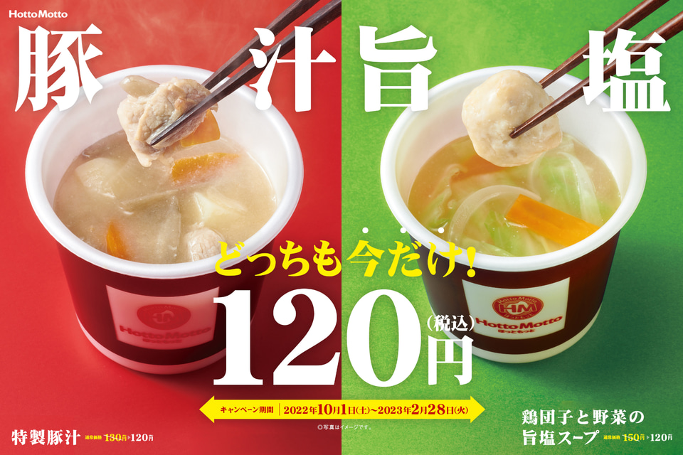 ほっともっと」寒くなる季節にうれしい!今年の冬ずっと楽しめる『特製豚汁』『鶏団子と野菜の旨塩スープ』の2商品 期間限定キャンペーン価格120円!株式会社プレナスのプレスリリース。