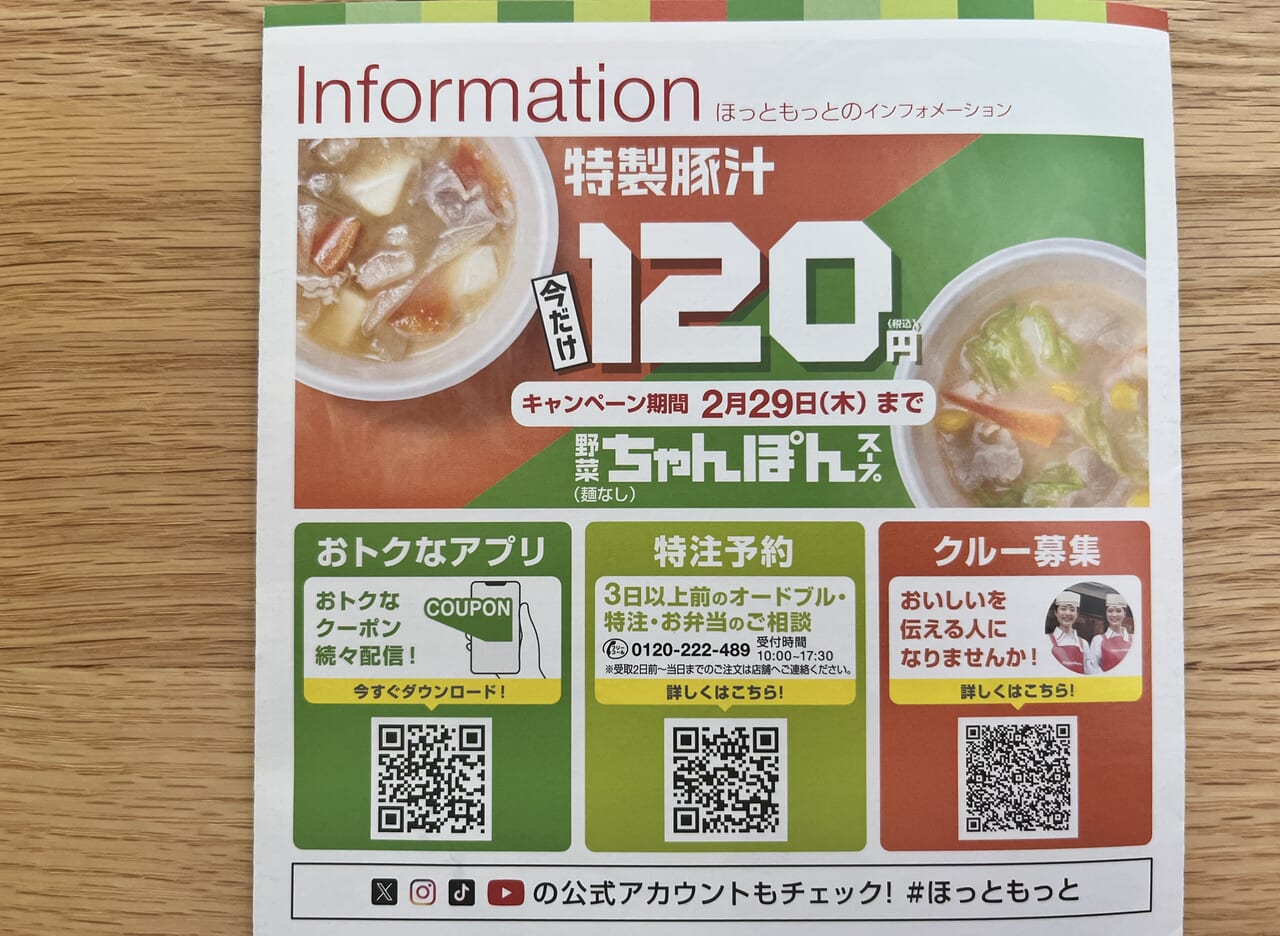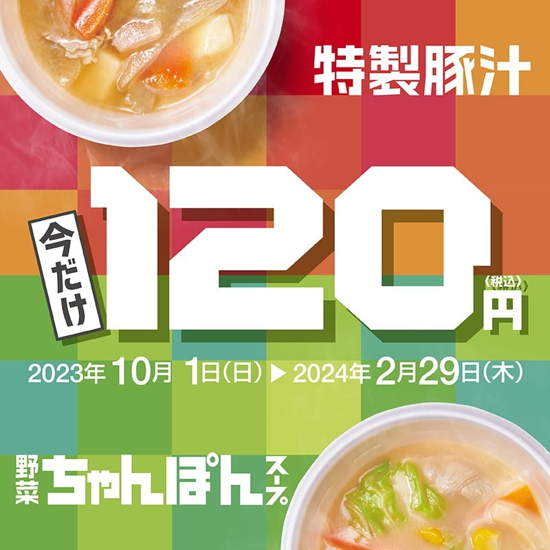 ほっともっと、サイドメニュー「特製豚汁」「野菜ちゃんぽんスープ 麺なし 」期間限定120円に!マイナビニュース。