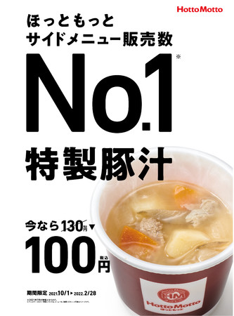 ほっともっと HottoMotto - \特製豚汁100円キャンペーン中おいしくて体も温まると評判の「特製豚汁」。本日10月1日から3月31日まで、通常130円が100円とかなりお得になります。 寒くなる秋から冬の間、この温もりを100円で楽しめるなんて好きなお弁当と一緒に。
