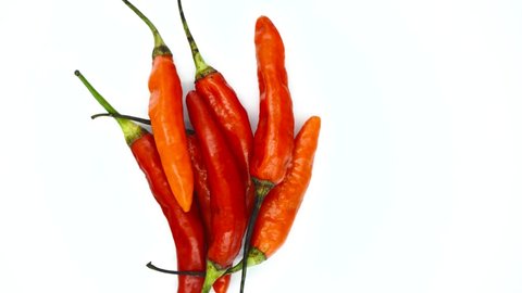 白い背景にいくつかの熟した赤と緑の鳥の目の唐辛子が置かれています。これらは非常に辛い唐辛子であり、私が自然と有機的に成長する野菜です。写真素材2625854971Shutterstock。