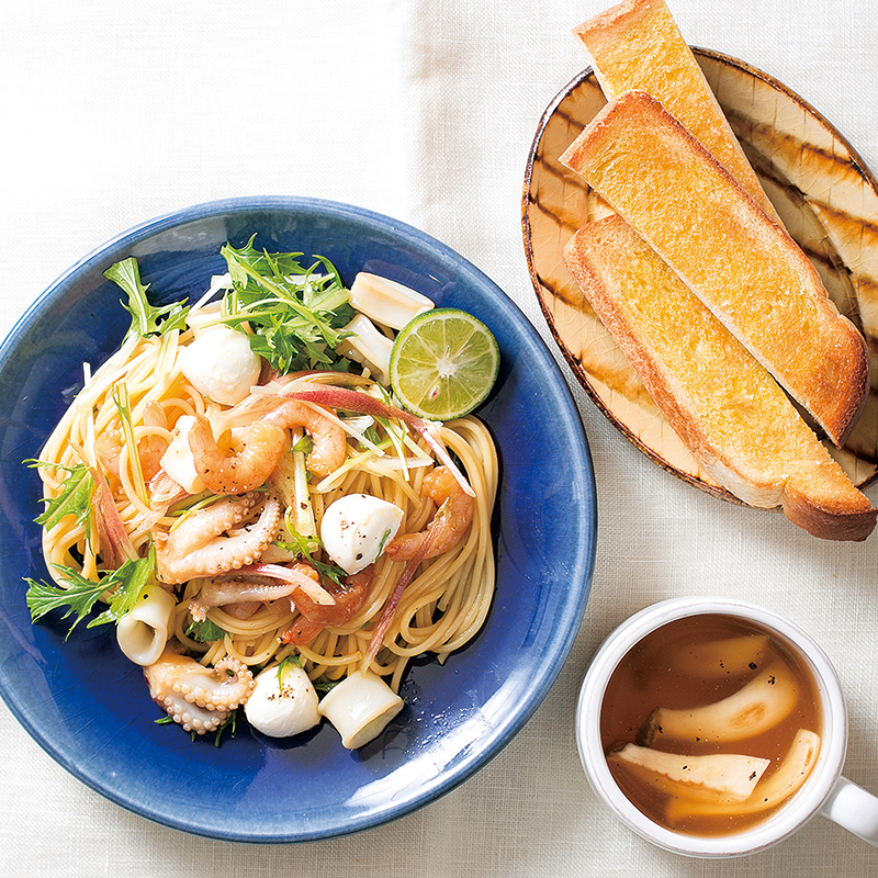 シーフードとモッツァレラの冷製パスタ&フォカッチャ風トースト 2人分。