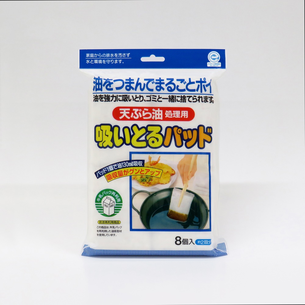吸いとるパッド 8個入 K-070 「ゆうパケ送料無料」油処理剤 てんぷら油用 料理油 揚げ物 廃油 簡単 手が汚れない シート パッド 吸う吸収 日本製。