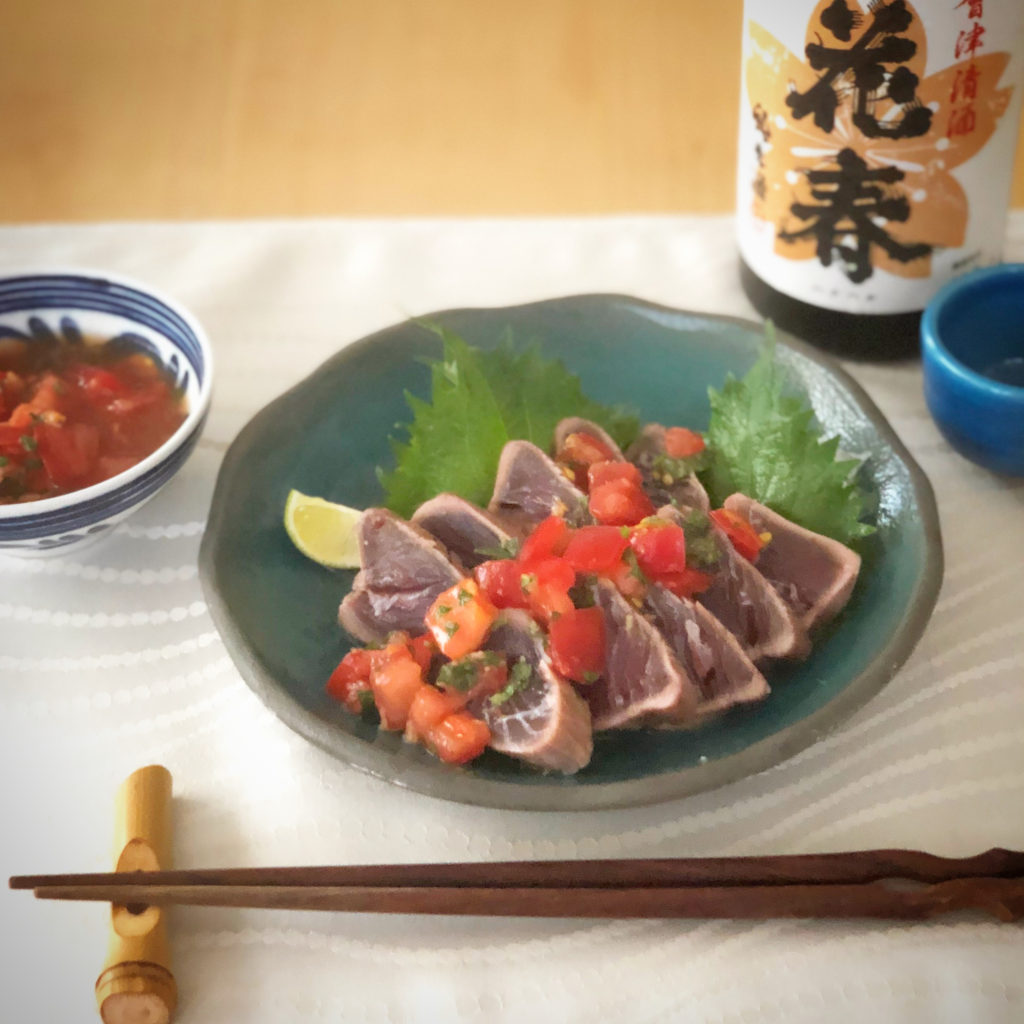 フライパンで簡単!カツオたたきの作り方&鰹のたたき 煎り酒トマトだれ」MINAMINA.KITCHEN sweets lotus。