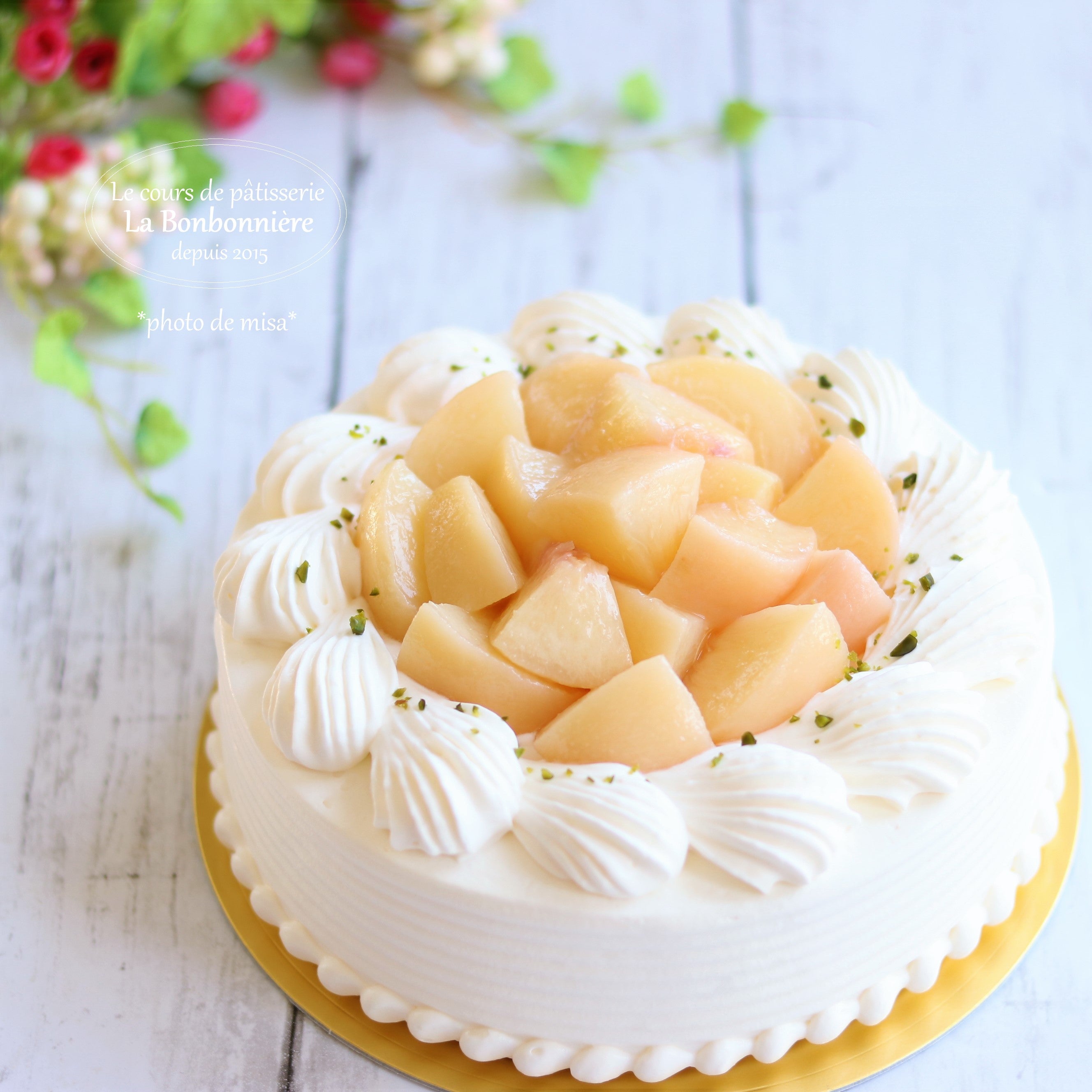 桃のバラ飾り!華やかなデコレーションケーキ♡ -公式 埼玉のお菓子・料理教室キッチンパフェ。