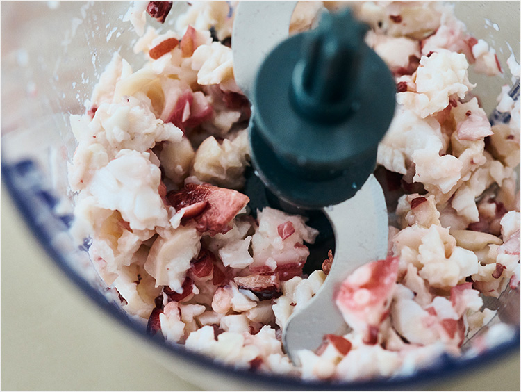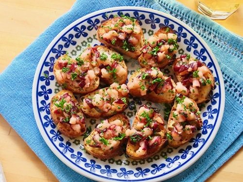 食感も見た目もたのしい「たこミンチのガーリックブルスケッタ」のレシピ。