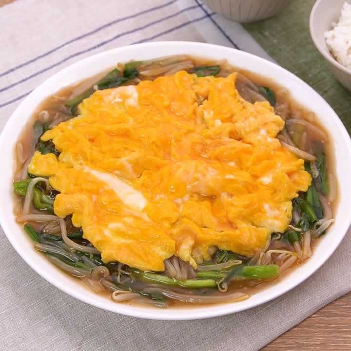ふわとろ美味しい! ニラもやしのあんかけ卵のせ。