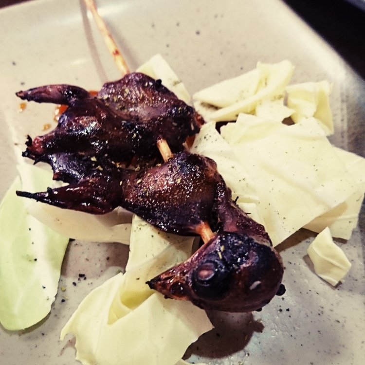 マスーン on X: "どんがめ西宮北口店にてスズメの丸焼き 初体験。京都市伏見の伏見稲荷大社では名物らしいです。肝心の味ですが、全体的に骨っぽくパリパリした食感が強く個性的な味はあまりしません。自己主張しないところが スズメなんですかね? スズメ丸焼きすずめ。
