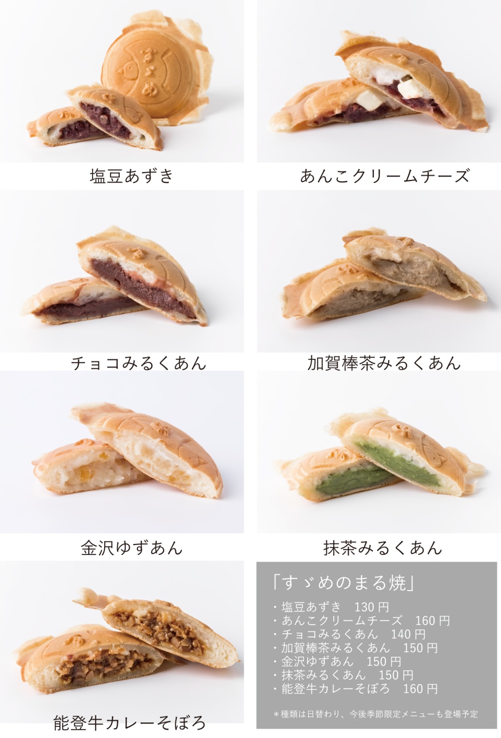 すゞめ すずめ 近江町市場店」限定の「すゞめのまる焼き」は新名物。能登牛カレー、塩豆あずき、加賀棒茶、金沢ゆずなど金沢らしい味が。