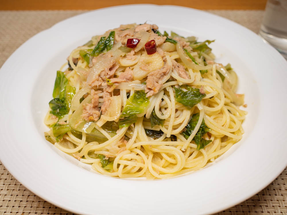 あるものでつくるツナとレタスのパスタ。