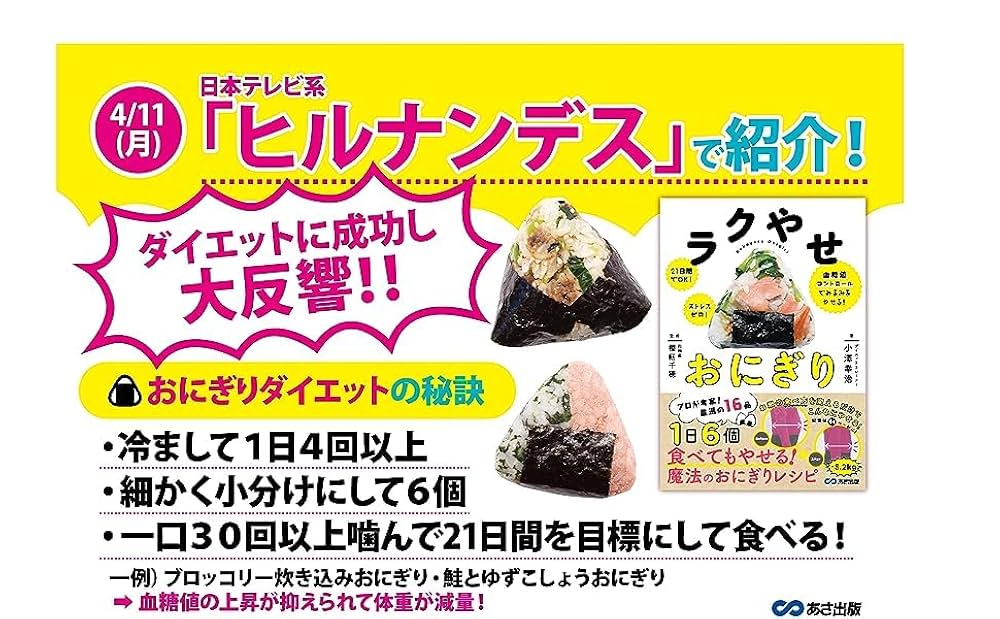 あさ出版公式 あさしゅっパン on X: " たのやく 9月号 様にてご紹介です。ありがとうございます! 食欲を満たしながらのダイエット! おにぎり食べていいんです!21日間でOK!ストレスゼロ!血糖値コントロールでみるみるやせる!『 ラクやせおにぎり🍙』https:t。