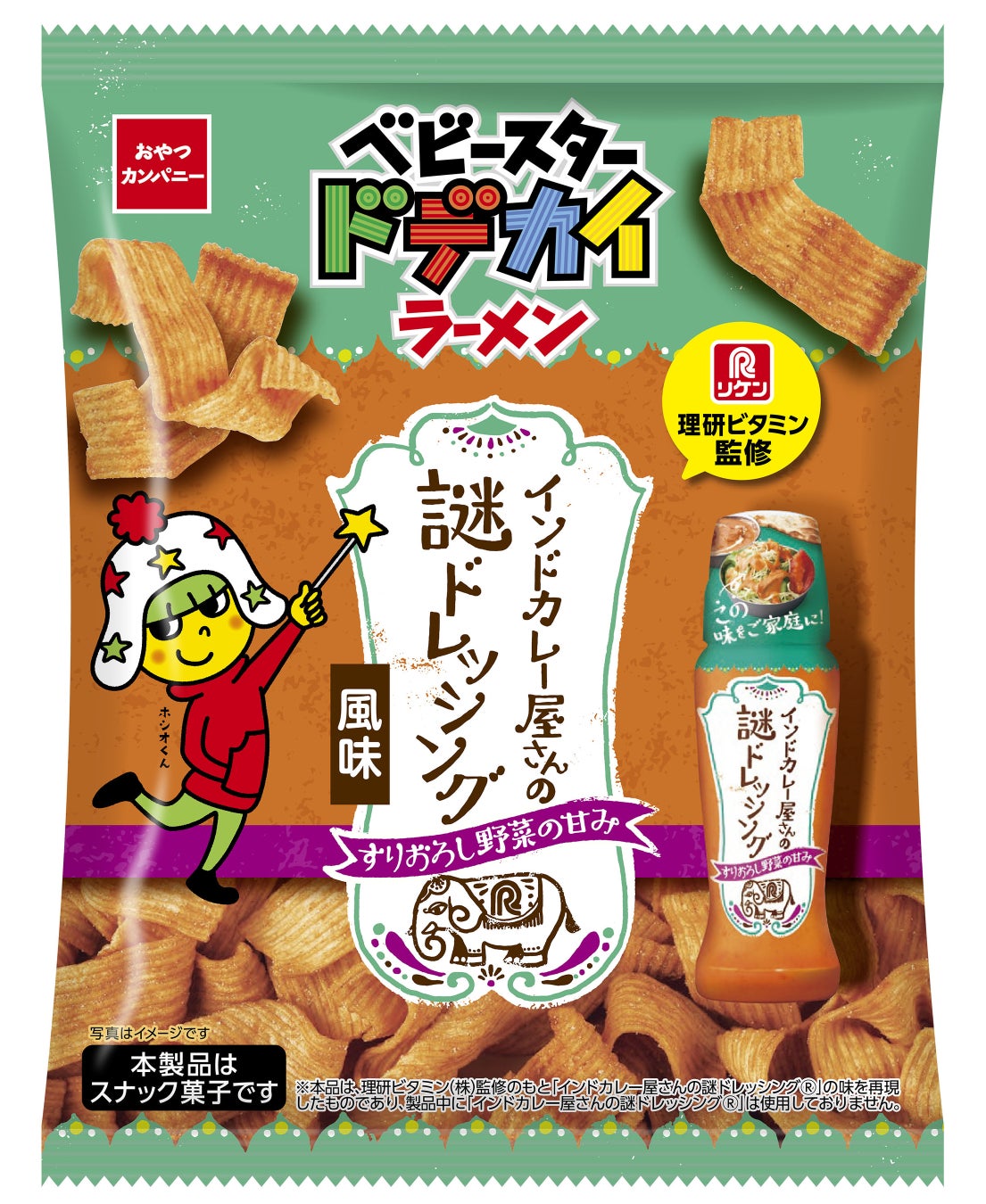 ドレッシング風味のベビースター!?ベビースター and 理研ビタミンで「インドカレー屋さんの謎ドレッシング®」「リケンのノンオイル青じそ」との初コラボベビースター新発売株式会社おやつカンパニーのプレスリリース。