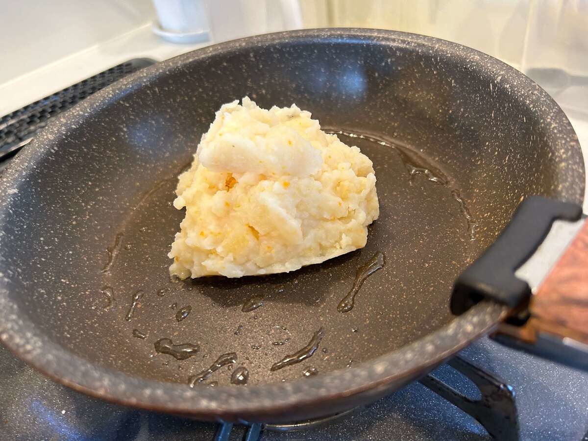 じゃがりこ 公式on X: "作り方 1⃣切り餅を16等分する 2⃣じゃがりこを耐熱容器に移し、熱湯120㏄を入れマッシュポテトを作る 塩少々加えておく3⃣油をひいたフライパンにマッシュポテトを広げ、切り餅を押しこむように並べ加熱する 4⃣チーズ適量を入れつつ両面。