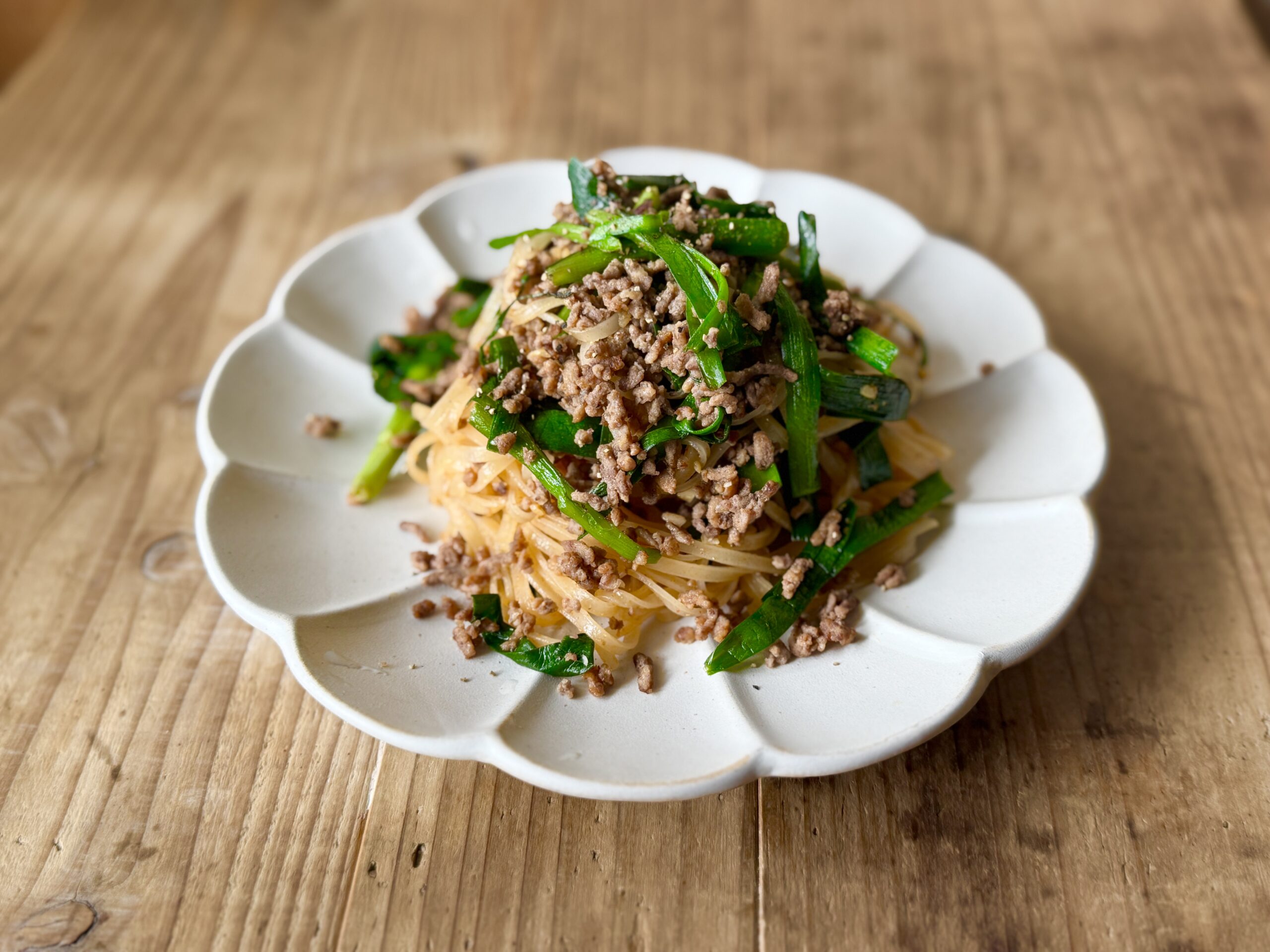 パッタイ麺でニラとひき肉のピリ辛炒め栄養士みさころの簡単レシピ。