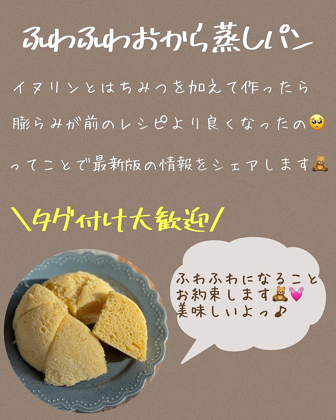 レンジで3分!腸活蒸しパン💛, 小麦粉も米粉も使わない, おからパウダーの蒸しパンです!, 前回朝ごはんで投稿したレシピと同量。,ふわふわ感を伝えたくて, リールで投稿してみました🥹🩷, 子どもたちにも大人気で, おやつにリピートしまくってます🫶🏻,おからパウダーはスーパーで, 数百円で買えるので, ぜひぜひ試してほしいです!, 私がよくふらついているAEONでは,。