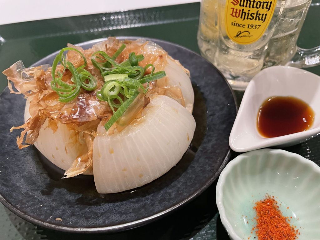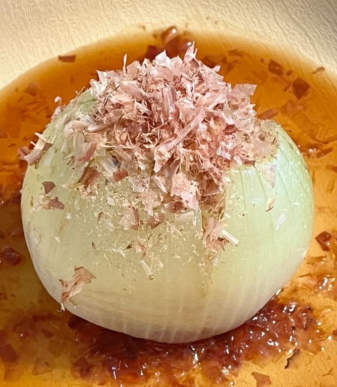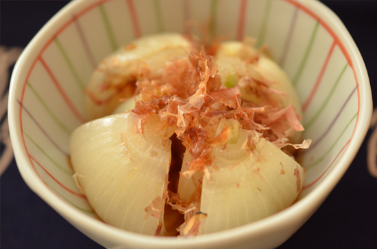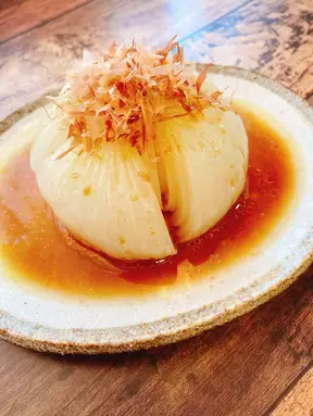 インパクト抜群! 丸ごと玉ねぎのおかかポン酢。