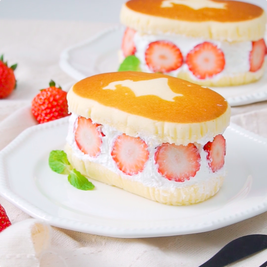 🍓スフレチーズケーキのいちごサンド🍓 * 最近、igでよく見かける北海道チーズ蒸しケーキ のいちごサンド🍓いつもと〜っても素敵なスイーツを作ってらっしゃる✨きみさん✨ @kimi.3t2 の北海道チーズ蒸しケーキアレンジ。