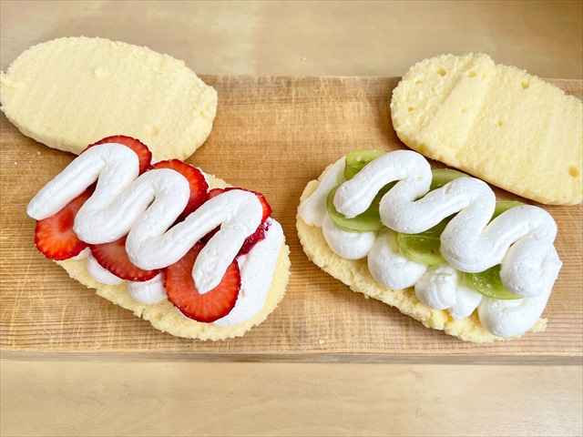 北海道チーズ蒸しケーキで作る「フルーツサンド」速攻出来て超美味しい!市販のホイップクリームとフルーツで簡単に出来るフルーツサンド。