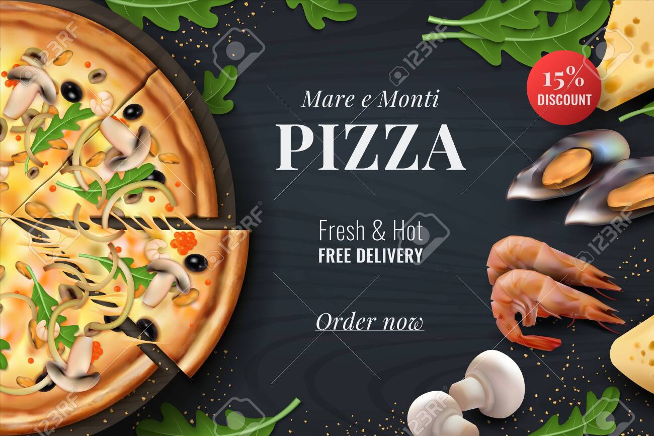現実的なピザの背景。伝統的なイタリア料理のメニューポスターとレストランのバナーや広告用のトッピング。現実的なシンボルイタリアのスナックとベクトル3Dプロモーションチラシのデザインのイラスト素材・ベクターImage 142140849。