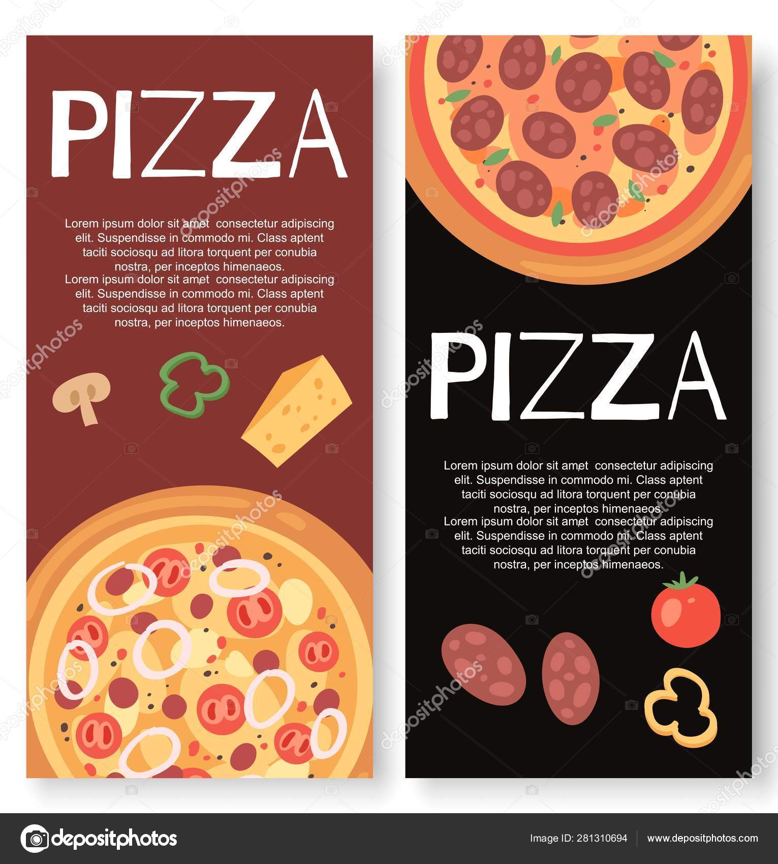 ピザやピッツェリア イタリアンレストランやファーストフードのメニュー ベクトルポスター ファーストフードピザの家の配達とフードコートマルゲリータカルボナーラ カプリッチオーザまたはナポリタンのためのイタリアのピザイオーログルメメニュー ストックベクター。